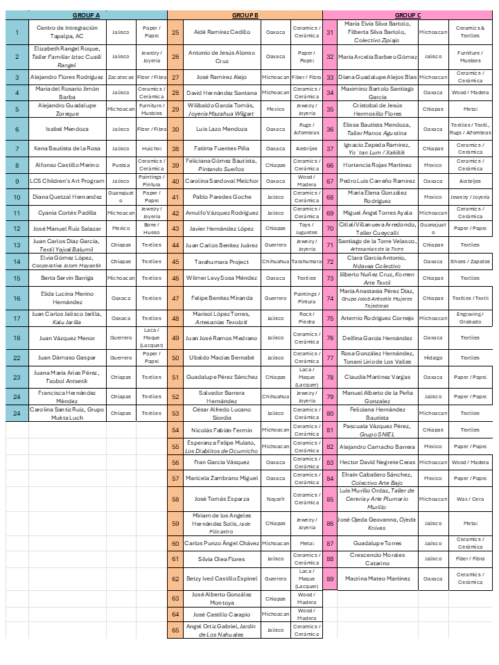 A medida que crecimos, se formó el Comité de Selección de Artistas para supervisar qué artistas serían invitados cada año; luego, los Dioses de la Feria encontraron tres coordinadores estatales que ayudarían a seleccionar a los artesanos de sus estados: Oaxaca (Linda Hanna), Chiapas (Brigitte Ordoquy) y Michoacán (Terry Baumgart).